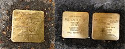 | Stolpersteine von Hevesys in Freiburg im Breisgau, links: neben den chemischen Instituten in der Albertstraße, rechts: von Pia und Georg vor ihrem ehemaligen Wohnsitz in der Rosastr. 21 | Selbst fotografiert | Sirius15 ( Diskussion ) | Datei:Stolperstein hevesy.jpg |