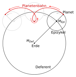 Damit stellt sich der von der Erde aus beobachtete Planetenumlauf als Überlagerung dieser Bewegungen dar. Teilweise wurden dann auch noch weitere Bahnen um diese Kreise modelliert. Berechnungen innerhalb dieses Modells waren sehr kompliziert. Durch den Einsatz von insgesamt etwa 80 solcher Bahnen konnte Ptolemäus das geozentrische Weltbild mit den damals möglichen Beobachtungen der Planetenbewegungen in Einklang bringen. Bei optimaler Wahl der Parameter hätte allerdings ein System mit nur neun Epizyklen eine vergleichbare Genauigkeit erreichen können.[5]