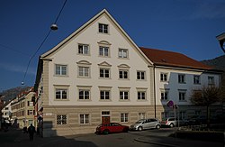 aus dem DEHIO Vorarlberg 1983: Bregenz , Anton-Schneider-Straße Nr.14 Bezirksgericht. Erbaut von Johann Georg Kuen (?), 1680. Eckhaus zur Bergmannstraße, durch den Freiplatz vor der Nationalbank in der Achse der Anton-Schneider-Straße frei sichtbare 3geschossige Giebelfront mit fünf Fensterachsen, Satteldach und Ortstein, Erdgeschoß gebändert und rustiziert; 3geschossiger Anbau zur Bergmannstraße, Erdgeschoß wie Hauptgebäude; gerade, Segmentbogen- und Dreieckgiebelverdachungen; in der Front der Anton-Schneider-Straße gefasstes Rundbogenportal aus Sandstein, bezeichnet 1680, zeitgenössische Türflügel mit Beschlägen. | Eigenes Werk Quelle: Dehio Vorarlberg | böhringer friedrich | Datei:Anton-Schneider-Straße 14, Gericht Bregenz.JPG | |