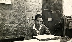 | Gershom Scholem sitting in Sukka learning Zohar | This image is available from National Library of Israel under the digital ID. 003800553 (003800553) | Autor/-in unbekannt Unknown author | Datei:Gershom Scholem learning the Zohar (NNL 003800553).III.jpg | |