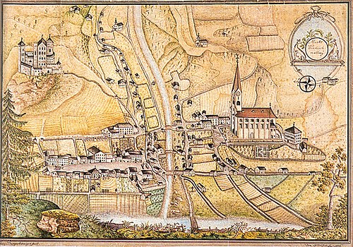 | Matrei 1826 nach einem Aquarell des Gerichtsbeamten und Freizeitmalers Franz Burgschwaiger | Scan of Forcher, Michael (Redak.): Matrei in Osttirol. Ein Gemeindebuch zum 700-Jahr-Jubiläum der ersten Erwähnung als Markt 1280-1980. Matrei 1996 | Geiserich77 | Datei:Matrei 1826.jpg | |