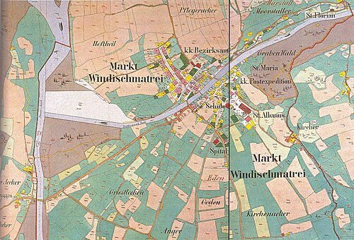 | Die Katastral-Urmappe von Matrei in Osttirol um 1860. Legende: rosa = Steinhäuser gelb = Holzhäuser, Ställe und Futterhäuser rot = öffentliche Gebäude dunkelgrün = Gärten hellgrün = Wiesen beige = Äcker | Scan of Forcher, Michael (Redak.): Matrei in Osttirol. Ein Gemeindebuch zum 700-Jahr-Jubiläum der ersten Erwähnung als Markt 1280-1980. Matrei 1996 | Geiserich77 | Datei:Matrei um 1860.jpg | |