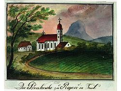 | Ansicht der Pfarrkirche Regau ; Aquarell aus dem 1. Viertel des 19. Jh. | www.ortsansichten.at -> Ort -> Österreich -> Oberösterreich -> Vöcklabruck -> Regau -> Regau-Blick auf die Pfarrkirche von Regau (OA I 230/1) Anm: direkt aufs Bild verlinken scheint nicht zu gehen | Josef Löw | Datei:Regau Historische Ansicht.jpg |