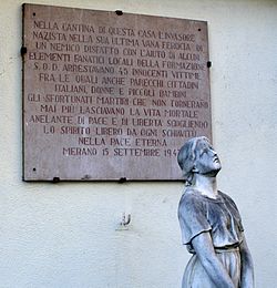 | Denkmal für die Meraner Juden, die 1943, drei Tage nach dem deutschen Einmarsch verhaftet worden sind. Sie wurden ins Balilla-Haus, Otto-Huber-Straße 36, gebracht und von da aus deportiert. Das Denkmal steht im Hof des Hauses. Übersetzung der Inschrift: Im Keller dieses Hauses hat der Nazi-Eindringling, in seiner letzten vergeblichen Grausamkeit eines erschöpften Gegners, mit Hilfe einiger einheimischer fanatischen Elemente des SOD , 45 unschuldige Opfer – unter ihnen auch viele italienische Bürger, Frauen und kleine Kinder – verhaftet. Die unglücklichen Märtyrer, die niemals zurückkehren werden, haben das sterbliche, den Frieden und die Freiheit herbeisehnende Leben hinter sich gelassen, den freien Geist im ewigen Frieden von jeder Sklaverei loslösend. Meran 15. September 1943 | Eigenes Werk | ManfredK | Datei:Denkmal für die von Meran deportierten Juden.jpg | |