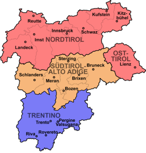 - ↑ Nicht markiert sind die zum altösterreichischen Kronland gehörenden Gemeinden Cortina d’Ampezzo, Livinallongo del Col di Lana, Colle Santa Lucia (BL), Valvestino, Magasa (BS) und Pedemonte (VI), die sich in Volksabstimmungen ausnahmslos für eine Wiederherstellung der historischen Landesgrenzen ausgesprochen haben.