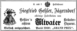 | Werbung von Siegfried Geßler . Text: K. und k. Hoflieferant. Siegfried Geßler, Jägerndorf alleinige Fabrikation von Geßler’s echtem Altvater Kräuter-Liqueur. Vielfach ausgezeichnet. Paris 1900: „Grand Prix“. | Wiener Zeitung, Festnummer. S. V | unbekannt | Datei:Wiener Zeitung 8-8-1903 165 Gessler.png |