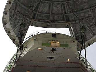 | Close-up view of the raised nose cargo door and hinge of a Boeing 747-8F . On the side of the protruding flight deck, the two leadscrews of the nose-raising mechanism can be observed. The inside of the nose features copious insulation. | Eigenes Werk | Olivier Cleynen | Datei:Detail of raised nose cargo door of Boeing 747-8F.jpg | |