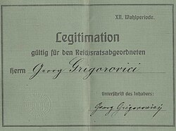 Identity card issued (under the germanized name Georg Grigorovici ) to Gheorghe Grigorovici (1871-1950), Romanian ethnic, member of the Parliament of Austria | Family archive of Radu Grigorovici | Victor Blacus | Datei:Gheorghe Grigorovici Legitimation.jpg |