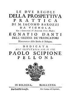 | Le due regole della prospettiua prattica di m. Iacomo Barozzi da Vignola, con i commentari del reuerendo padre maestro Egnatio Danti dell'ordine de' predicatori mattematico dello Studio di Bologna. …. - In Bologna : per Gioseffo Longhi, 1682 (In Bologna : per Gioseffo Longhi, 1682). - 12, 145, 7 p. : ill. in parte calcografiche, front. calcografico ; 2° . | Verfügbar in der digitalen Bibliothek der Europäischen Bibliothek für Information und Kultur (BEIC) und hochgeladen im Rahmen einer Partnerschaft mit der BEIC . | Giacomo Barozzi da Vignola | Datei:Vignola - Due regole della prospettiva prattica, 1682 - 1375259.jpg | |