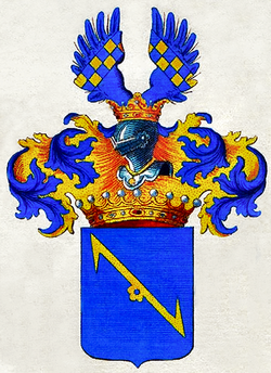 Blasonierung des Wappens von 1699: Im blauen Schilde ein schrägrechts gestellter, doppelter, goldener Widerhaken; die obere Spitze desselben kehrt sich rechts nach unten, die untere links nach oben und in der Mitte findet sich nach rechts und unten eine Erhöhung gleich einer auf- und absteigenden Stufe, welche oben im halben Zirkel gebogen und in der Mitte durchbohrt ist. Die Figur wird für ein Senkeisen alter Art, ein sogenanntes Gil-Eisen, gehalten. Auf der Grafenkrone steht ein gekrönter Helm, welcher einen offenen, blauen Adlersflug trägt, dessen rechter Flügel mit einem schräglinken, von Gold und Blau in zwei Reihen, jede zu sechs Feldern geschachteten Balken, der linke aber mit einem solchen schrägrechten Balken belegt ist. In Folge der Sachsen und Schwingen der Flügel sind freilich nicht alle Felder des geschachten Balkens zu sehen. Die Helmdecken sind blau und golden.[1]