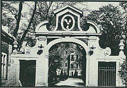 | Schloss Prugg in Bruck an der Leitha, Niederösterreich. Historische Aufnahme des Hauptportales. Gekrönt mit dem Wappen der Familie Harrach. Architekt Johann Lucas von Hildebrandt, Steinmetz-Bildhauer des Portales Giovanni Battista Passerini (+ 1710) | Abgedruckt in: Geschichte der Stadt Bruck a.d. Leitha von Josef Christelbauer, 1920. Daneben ein Foto des bereits damals reduzierten Portales.In den Mitteilungen des Museums- und Kulturvereines Kaisersteinbruch Nr. 37 Mai/Juni 1995 wurde diese historische Aufnahme dem heutigen, von mir Helmuth Furch ( Diskussion ) fotografierten Zustand gegenübergestellt. | N.N. | Datei:NÖ Schloss Prugg histor. Portal.jpg |