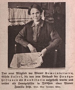 | Das Wiener Gemeinderatsmitglied Gisela Laferl (1884-1968, ab 1920 verheiratete Wozniczak), 1919. Foto von Max Fenichel (1885-1942). | Das interessante Blatt , 29. Mai 1919, p. 7 | Max Fenichel | Datei:Gisela-Laferl-1919.jpg | |