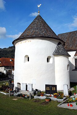 Der romanische Rundbau des 12. Jahrhunderts mit Kegeldach liegt südlich der Kirche und weist im Osten eine Rundapsis mit kleinem Rundbogenfenster auf. Beinkammer im Untergeschoß. Patronierte Holzdecke (Rosettenmuster) 16. Jahrhundert Blockaltar. – In der Torlaibung eingemauert die römerzeitliche Grabinschrift für den Sklaven Nigrus, errichtet von seiner Gattin Sura. 1987 erfolgt die Adaptierung als Aufbahrungshalle.