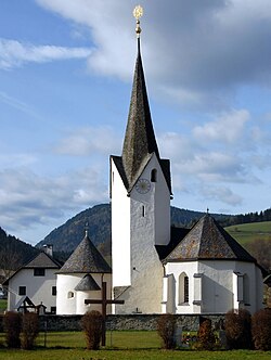 Spätgotischer Chor mit zweistufigen Strebepfeilern; hoher spätgotischer Sakristeiturm an der Chorsüdseite, ab dem zweiten Geschoß achteckig, Mauerscharten, achtseitiger Spitzhelm über vier Giebeln mit Segmentbogenarkatur, 18. Jahrhundert. Gemauerter Opfertisch in der Vorlaube. An der Süd-Fassade übermaltes Christophorus-Fresko. Rechts vom Eingang ein römerzeitliches Grabrelief mit der Darstellung eines Schreibers, ein römerzeitlicher Bauquader mit Rankenrelief an der linken Türwange des Sakristeieingangs. Beckiger Weihwasserkessel. Spätklassizistischer Pyramidengrabstein des Peter Kernmayr (gestorben 1843).
