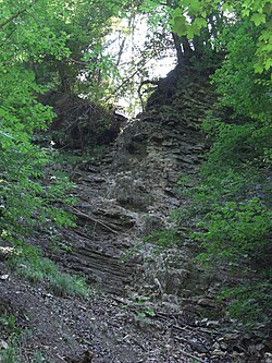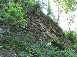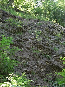 | 6 | Eingleitung | Ein Stück weiter vom Standpunkt 5 trifft man auf eine etwa zwei Meter dicke Brekzieneingleitung im roten Knollenkalk. |