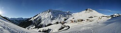 | Blick vom Fusse des Zafernhorn im Ortsgebiet von Fontanella - Faschina auf links die Bettlerspitze, Rote Wand 2.704m , Formarin Rothorn, Glattmahd dem Gronggenkopf und der Kellaspitze. Die Bildmitte zeigt das Sonnenköpfle. Der markante Spitz ist der höchste Berg des Bregenzerwaldgebirges : das Glatthorn 2.134m . Der Hahnenkopf ist mit Lawinenfangzäunen verbaut. In der rechten Bildecke sieht man ganz klein der Hochblanken, das Hohe Licht, die Damülser Mittagspitze und zum Schluß der Elsenkopf auf den der Ugalift hinaufführt. Über das Faschina Joch gelangt man auf Damüls und in den Bregenzerwald . Über die Faschina Straße fährt man links hinunter in das Große Walsertal . | Eigenes Werk | böhringer friedrich | Datei:Faschina Panorama.jpg | |