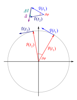 Anhand der vektoriellen Betrachtung lässt sich auch die erforderliche Beschleunigung für eine Richtungsänderung ohne Betragsänderung der Geschwindigkeit ermitteln. Analog dem Vorgehen bei der Betrachtung des Geschwindigkeitsvektors erfolgt die Herleitung der Beschleunigung. Der Beschleunigungsvektor steht senkrecht auf dem Geschwindigkeitsvektor und zeigt zum Kreismittelpunkt.