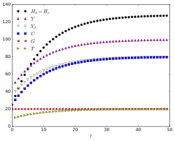 | Plot des Modells SIM aus dem Textbuch Monetary Economics von Wynne Godley und Marc Lavoie, 2007. Für Parameter und Anfangsbedingungen, siehe Quellcode in python unten. | Eigenes Werk | Sfcler | Datei:Godley-lavoie-chapter-3-sfc-model-plot.svg | |