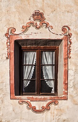 | Die rechteckige Fensteröffnung ist eckig ziegelrot gerahmt, oben und unten in der Mitte mit abgesetzter Rahmung akzentuiert und oben und unten mit ziegelroten Rocaillen verziehrt. Die Rocaillen fallen seitlich noch etwas dem Rahmen entlang nach unten. Die obere Verzierung ist überhöht mit einer ziegelroten Krone. Rahmen, Rocaillen und Krone sind dunkelbraun konturiert und eigentümlich mit gräulichen Schatten profiliert. | Eigenes Werk | Dateien (Bilder, Videos, Audios) des Medienarchivs Wikimedia Commons unterstehen einer Freien Lizenz . Diese Freiheit bedeutet nicht, dass dadurch das Urheberrecht entfällt. Im Gegenteil: Als Gegenleistung für die kostenlose Nutzung muss der Weiternutzer die Lizenzbedingungen einhalten. Er muss den Fotografen/Autor Martin Thurnherr als Urheber nennen und die Quelle (Wikimedia Commons) angeben - wenn möglich mit Link zur Originaldatei. Dieses Bild wurde von Martin Thurnherr erstellt. Wenn Sie eines meiner Bilder nutzen möchten, bin ich für eine E-Mail (Account nötig) oder eine Nachricht auf meiner Diskussionsseite dankbar. Bitte beachten Sie die Lizenzbedingungen. Auch andere Lizenzierungsmöglichkeiten sind diskutierbar. | Datei:Fresco Fenster Glurns 01.jpg | |