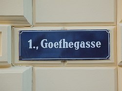 | Straßentafel Goethegasse, Wien-Innere Stadt | Eigenes Werk | Buchhändler | Datei:Goethegasse 01.JPG | |