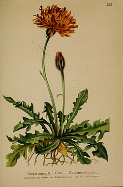 | 283. Crepis aurea (L ) Cass. — Goldener Pippau.. Alpenkette, aufwiesen, bes. Kalkboden, 1600— .500 M. Juni-Augt.st. | https://www.flickr.com/photos/biodivlibrary/10192331066 | Dalla Torre, K. W. von; Deutscher Alpenverein (Founded 1874); Hartinger, Anton | Datei:Atlas der Alpenflora (10192331066).jpg | |