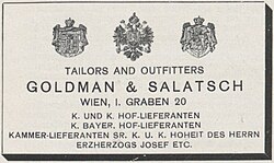 - ↑ Goldman & Salatsch. In: Jubiläums-Festnummer der kaiserlichen Wiener Zeitung 1703–1903. Beilage Kommerzieller Teil. Alfred von Lindheim. Druck und Verlag K. K. Hof- und Staatsdruckerei, Wien, 8. August 1903, S. 155, abgerufen am 31. Juli 2009.