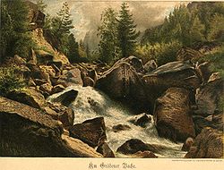 | The "Dursan" creek, an old maybe celtic name for Val Gardena. "Nach einem Aquarell von Hermann Krabbes. Choromotypographie von Fisher &Wittig in Leipzig" | Eigenes Werk | This Photo was taken by Wolfgang Moroder . Feel free to use my photos, but please mention me as the author and send me a message . Dieses Bild ist nicht gemeinfrei . Dies bedeutet, dass es u. a. Urheberrechtsschutz genießt. Es darf nur nach den hier genannten Regeln (oder mit ausdrücklicher Genehmigung des Urhebers) genutzt werden. Dies schließt insbesondere eine Verwendung in sozialen Netzwerken aus , deren Nutzungsbedingungen der hier aufgeführten Lizenz nicht entsprechen. Bitte lade an dieser Stelle keine auch nur minimal veränderte Fassung ohne Rücksprache mit dem Urheber hoch. Der Urheber möchte Korrekturen nur an der ihm vorliegenden unkomprimierten Quelle vornehmen. So ist gewährleistet, dass die Änderungen erhalten bleiben und dass keine unnötigen Kompressionsartefakte entstehen. Wenn du meinst, dass Änderungen erforderlich sein sollten, informiere bitte den Urheber oder lade eine Bearbeitung als neues Bild unter neuem Namen und unter Verwendung der Vorlage Derivat bzw. der Vorlage Extrakt hoch. | Datei:Grödnerbach old print.jpg |