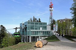 | Im Vordergrund die Bergstation der Grünbergseilbahn auf dem 984 m hohen Hausberg der Gmundner in der oberösterreichischen Stadtgemeinde Gmunden und rechts hinten ein Sender sowie der 2018 errichtete Aussichtsturm. | Eigenes Werk | C.Stadler/Bwag | Datei:Gmunden - Grünberg, Seilbahnstation.JPG | |