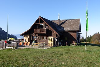 | "Grünburger Hütte" des Österreichischen Alpenvereins in den Oberösterreichischen Voralpen, Gemeinde Steinbach an der Steyr. Blick Richtung Westen, links im Hintergrund der Traunstein. | Eigenes Werk | Christian Wirth, Wirthi | Datei:Grünburger Hütte.jpg | |