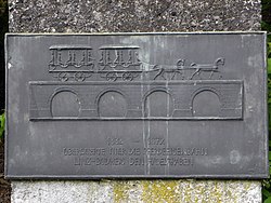 - Von der ursprünglichen, etwa 1,3 km langen Pferdeeisenbahn-Trasse entlang des Gründbergs[14] ist nur mehr das westliche Widerlager der großen, vierbogigen Steinbrücke über den Haselgraben gut zu erkennen. An dieser Stelle befindet sich am Rand der Leonfeldener Straße das Pferdeeisenbahn-Denkmal mit folgender Inschrift:
