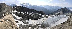 Der Große Muntanitz vom Gradötz aus gesehen, davor das Gradötzkees (Gletscherstand Juli 2022), links der Kleine Muntanitz, rechts der Obere Muntanitzpalfen, vorn mittig der Gradötzsattel (Silesia-Höhenweg Sudetendeutsche Hütte - Rudolfshütte) (von links nach rechts) |