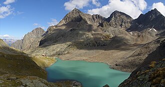 | Gradental: Adolf-Noßberger-Hütte (2488 m) below Petzeck (3283 m); Gradensee (lake) - September 2011. | Eigenes Werk | RRady | Datei:AdolfNossbergerHuette below Petzeck (09-2011).jpg | |