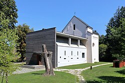 | Südwestansicht der röm.-kath. Filial- bzw. Autobahnkirche Maria im Walde in Dolina, eine Ortschaft in der Kärntner Marktgemeinde Grafenstein. Die Kirche wurde nach einer Marienerscheinung im Jahr 1849 errichtet und 1863 von Bischof Valentin Wiery geweiht. 1887 begann man mit dem Bau des Turmes, der am 6. Juli 1889, zwei Tage vor dem Kirchweihfest, einstürzte und das Kirchenschiff zerstörte. In der Folge begnügte man sich mit dem Altarraum. In den 1950er Jahren wurde dann doch ein einfaches Kirchenschiff an das mächtige Presbyterium angebaut und am 11. August 1957 geweiht. Ende der 1990er Jahre erfolgte eine Generalsanierung und Umgestaltung, die nach Plänen der Architekten Ferdinand Certov und Robert Morianz erfolge. Da zu dieser Zeit in unmittelbarer Nähe die Südautobahn gebaut wurde, adaptierte man sie gleichzeitig zur ersten Autobahnkirche Österreichs (feierliche Weihe am 7. Mai 2000 durch Bischof Egon Kapellari): 1 . | Eigenes Werk | C.Stadler/Bwag | Datei:Dolina (Grafenstein) - Kirche.JPG | |