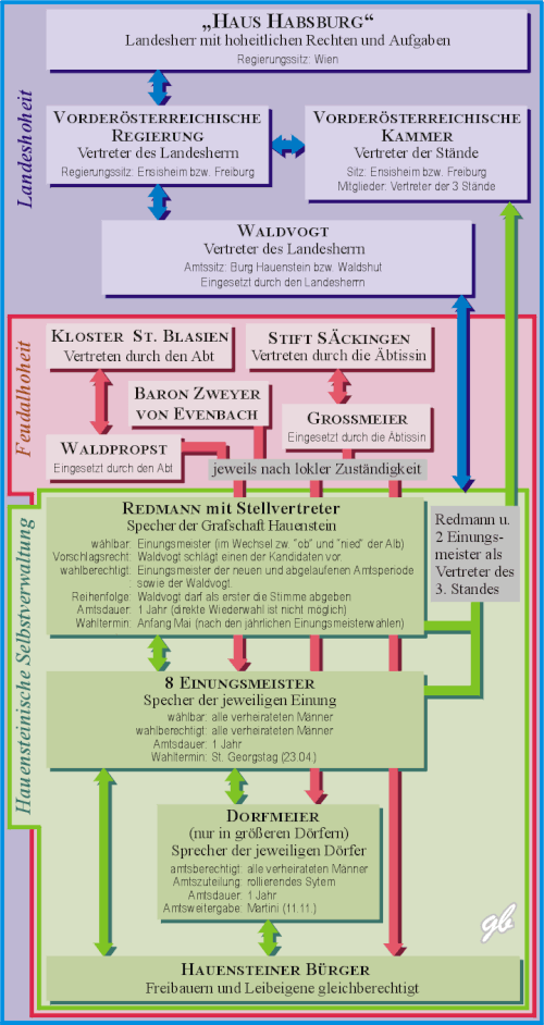 Die politische Struktur der Grafschaft Hauenstein hatte zur Zeit der Habsburger Herrscher, abgesehen von Zeiten der Verpfändung, drei Teile. Den hoheitlichen Teil, der vom Haus Habsburg wahrgenommen wurde, den feudalherrschaftlichen Teil, der sich auf verschiedene Feudalherren aufteilte und den selbstverwalteten Teil, der von den Bewohnern der Grafschaft in einer frühen demokratischen Struktur gestaltet wurde.