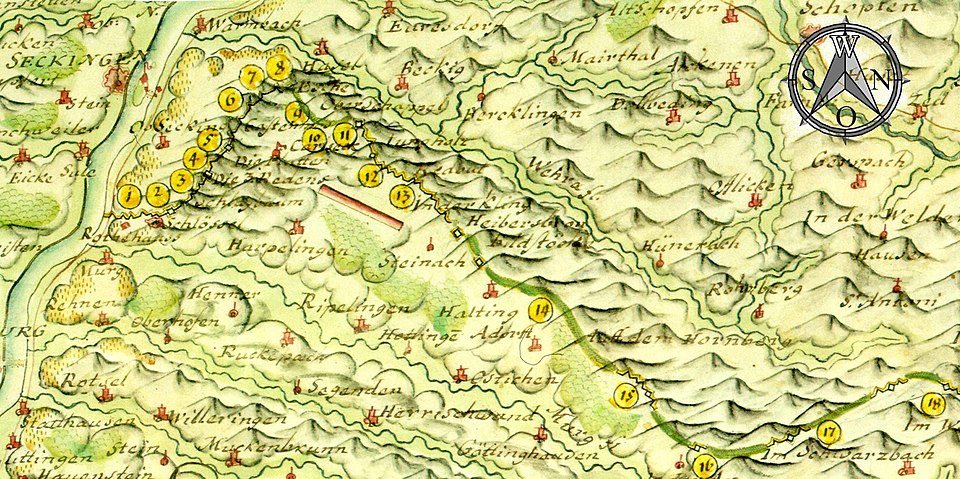| Darstellung der Fortifikationslinie an der Westgrenze der Grafschaft-Hauenstein in einem Ausschnitt der Karte Theatrum Belli Rhenani 1702 - 1713 von Cyriak Blödner (Originalmaßstab ca. 1:30000 aus Blatt 6 von 13 - ca. 57 x 43 cm pro Blatt). Das Original befindet sich im Kriegsarchiv in Wien. | Der Ausschnitt wurde einem Nachdruck entnommen, der in Kooproduktion verschiedener Landesvermessungsämter u. a. 1991 aufgelegt wurde. Die Karte ist gewestet. | unbekannt | Datei:Letzen.jpg |