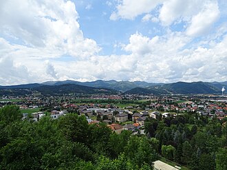 Blick von der Wallfahrtskirche Maria Straßengel auf die Ortschaften Hundsdorf, Rötz (beide links), Gratwein (mittig) sowie Straßengel und Judendorf (rechts im Vordergrund) |