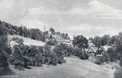 | Baracken des Reichsarbeitsdienst-Lagers St. Oswald in Freiland, Steiermark. Oben die Kirche St. Oswald (mit Dach des Wirtschaftsgebäudes), rechts der Gasthof „Triftweber“ (noch mit dem später abgerissenen Wirtschaftsgebäude, das sich auf der Straßentrasse der späteren Hebalmstraße befand). Links das Anwesen „Triftschuster“ (später Pension Hubertus, Gemischtwarenhandlung Familie Kargl). Im Vordergrund die Masten der Telefonleitung von Deutschlandsberg zum Forsthaus Hebalm des Malteser-Ritterordens, der damals den einzigen Telefonanschluss im Koralmgebiet westlich des Ortes besaß. | Kopie einer alten Fotographie, Familienarchiv | unbekannt, Familienarchiv, eigene Bearbeitung. Author could be my father or my mother, it was part of the inheritance, I'm the universal heir of both persons. | Datei:Arbeitsdienstlager St Oswald 1940.jpg | |