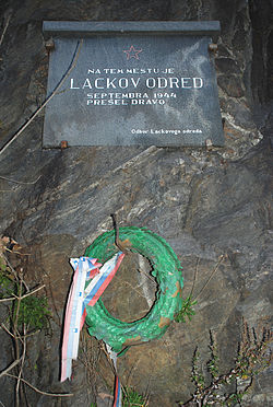 | Gedenktafel ca. 200 m östlich von Ožbalt (St. Oswald im Drauwald, St. Oswald an der Drau), Slowenien an den Drauübergang des Lackov-Verbandes der damaligen jugoslawischen Partisanen (Kampfgruppe Lackov) | Eigenes Werk ( Originaltext: eigene Aufnahme ) | Josef Moser | Datei:Ozbalt Lackov Odred 1944.jpg | |