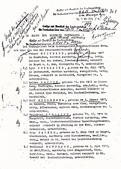 - ↑ Volksgericht: Urteil. S. 1 (siehe Bild). Die Altersangaben nach Lebensjahren weichen in den Quellen voneinander ab, je nachdem, wie lange die Tat zur Zeit der Entstehung der Quelle zurücklag.