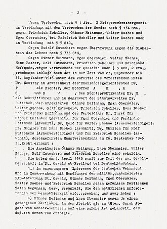 - Verbrechen nach dem Kriegsverbrechergesetz in Verbindung mit Mord: gegen Friedrich Scholler, Othmar Heitmann, Walter Sachse und Egon Obermaier.