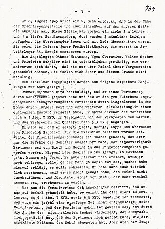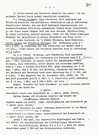 - Verbrechen der Quälerei: gegen Othmar Heitmann, Egon Obermaier, Walter Sachse, Hans Bacher, Rolf Kutschera, Friedrich Scholler und Ferdinand Hoffmann.