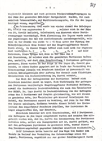 In der Ortschaft St. Oswald in Freiland in der Gemeinde Kloster war 1938 ein Lager des Reichsarbeitsdienstes errichtet worden, um die Straßenverbindungen des Gebietes, besonders den Weg über Klosterwinkel nach Sallegg und Gams auszubauen.[36] Die Baracken des Lagers standen auf Terrassen, die zwischen der Hebalmstraße und dem Weg zur Kirche angelegt worden waren.[37] Der Verlauf dieser Terrassen blieb im Gelände nachvollziehbar, auf ihrem Gebiet wurden ab 1946 Einfamilienhäuser und andere Gebäude des Ortskerns von St. Oswald gebaut. Das Lager wurde auch für Vorbereitungslager anderer Institutionen wie der Lehrerbildungsanstalt Marburg benutzt.[38] Im Lauf des Krieges wurde der Reichsarbeitsdienst immer stärker zu einer Unterstützungsorganisation der Wehrmacht, bis ihm 1944 auch die militärische Grundausbildung übertragen wurde. Die Bewohner des Lagers wurden letztlich im Rahmen der Wehrmacht gegen die Partisanen eingesetzt,[39] sie erhielten Ende November 1944 eine „Anti-Banditen-Ausbildung“[40] und wurden auf „Banditenstreife“ geschickt.[41]