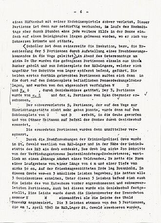 Die gefangenen Partisanen wurden in das RAD-Lager gebracht. Nach der telefonischen Meldung des Vorfalles an den Kreisleiter der NSDAP in Deutschlandsberg, Hugo Suette, gab der den Auftrag, die Gefangenen zu verhören und „umzulegen“. Dieser Auftrag wurde als Befehl gewertet und von den späteren Angeklagten befolgt.[55]