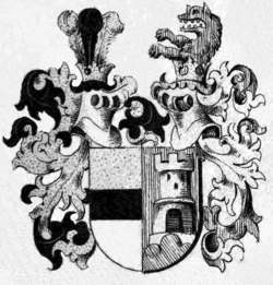 1643: Gespaltener Schild. Rechts von gold, Schwarz und silbern geteilt, links in Rot auf grünem Dreiberg ein silberner Zinnenturm. Zwei Helme. Auf dem rechten Helm drei Federn, golden, schwarz, silbern; auf dem linken ein roter (in anderer Beschreibung natürlicher), wachsender Wolf. Die Helmdecken sind rechts schwarz-golden und links rot-silbern.[6]