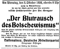 | historical marketing of a NSDAP meeting in Bad Kissingen 1926 (Saale-Zeitung, Bad Kissingen, 10-02-1926) | own work - reconstruction of the historical print | -- Antar2 01:47, 14 January 2008 (UTC)Antar2 | Datei:Bostunitsch Kissingen.jpg | |