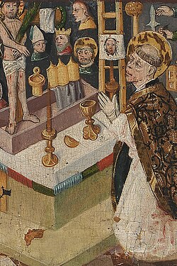 | Teil einer Votivtafel mit 16 Legendenszenen und Heiligen, Gregor der Große, Franken, um 1500, Tannenholz. | Germanisches Nationalmuseum | Hans Murer the Elder | Datei:Gregor der Große (Fragment einer Votivtafel um 1500).jpg | |