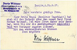 | Mit blauer Tinte maschinengeschriebene und eigenhändig unterschriebene Postkarte von Doris Wittner mit Adress-Stempel Mommsenstraße 16 in Berlin-Charlottenburg, datiert 25. September 1917, adressiert an Grete Meisel-Hess ; Text: „Berlin, d. 25.9.17 Sehr verehrte, gnädige Frau. Herr Fritz Engel ( Berliner Tageblatt ) hat mich mit dem Referat über den neuen Band Ihres Werkes betraut. Ich wäre Ihnen daher sehr dank- bar, wenn Sie mir die Aushängebogen möglichst bald vom Verleger zugehen liessen. Mit den verbindlichsten Grüßen Ihre ergebene Doris Wittner “ | https://www.kotte-autographs.com/de/autograph/wittner-doris/ | Doris Wittner | Datei:1917-09-25 Doris Wittner (Berlin Charlottenburg, Mommsenstraße 16) Karte an Grete Meisel-Hess.jpg | |