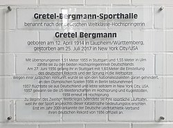 | Gedenktafel, Gretel Bergmann , Rudolstädter Straße 77, Berlin-Wilmersdorf , Deutschland | Selbst fotografiert | OTFW , Berlin | Datei:Gedenktafel Rudolstädter Str 77 (Wilmd) Gretel Bergmann.jpg | |
