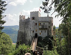 | Nordwestansicht der Burg Grimmenstein in der niederösterreichischen Marktgemeinde Grimmenstein . Nach einem Verfall wurde sie in den 1960er Jahren teilweise in neoromantischen Stil wieder aufgebaut. | Eigenes Werk | C.Stadler/Bwag | Datei:Grimmenstein - Burg.JPG | |