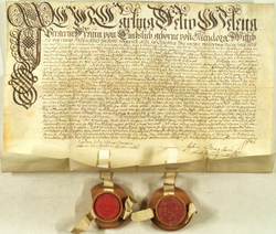 | Leihkaufsvertrag von 1695 über Schloss Müllegg: Die verwitwete Freifrau Carlina Felix Helena Perger von Emslieb, geb. von Mendoza, verkauft als Vormund für ihre Enkelkinder, die vier Kinder ihres verstorbenen Schwiegersohns, des Hoftruchsesses Johann Christoph Griming zum Niderrain, auf Müllegg, und ihrer Tochter Maria Angelina Griming, geb. Perger von Emslieb, nämlich Johann Friedrich Christoph, Johann Gottlieb, Johann Ferdinand und Maria Catharina Griming zum Niderrain, mit Unterstützung ihres Vetters, des Hofrats, Obersts und Leibgardeleutnants Johann Ludwig Griming zum Niderrain, auf Müllegg, dem Erzbischof Johann Ernst von Salzburg den adeligen Sitz Müllegg samt Zugehör um 6000 fl. und 100 Dukaten Leihkauf. Anhängende Siegel: 1.: Wappen Perger von Emslieb, 2.: Grimming zum Niederrain | Kalligrafisch gestaltete Leihkaufsvertragsurkunde | Autor/-in unbekannt Unknown author | Datei:Grimming-Verkaufsurkunde Schloss Muellegg 1695.png | |
